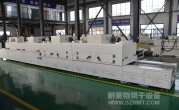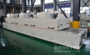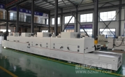 2、外形尺寸(約):總長(zhǎng)8000*高1600*寬1200mm,進(jìn)料部分長(zhǎng)1000mm,加熱部分長(zhǎng)6000mm(分3段溫區(qū)),收料部分長(zhǎng)1000mm。輸送帶離地高700mm;